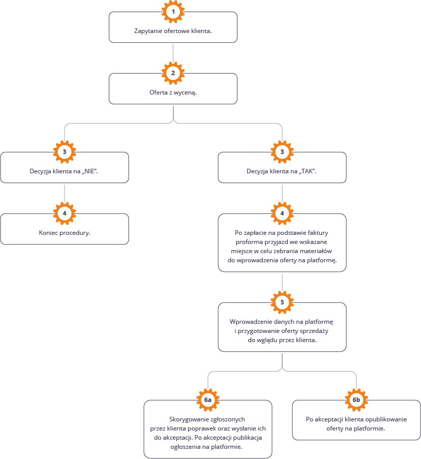 W zakres świadczonej usługi wchodzi przyjazd do siedziby Państwa Firmy lub w miejsce wskazane przez Państwa, gdzie znajduje się przedmiot oferty celem wykonania dokumentacji zdjęciowej, zebrania materiałów technicznych, jeżeli Państwo takim dysponują, ustalenia parametrów i oczekiwań co do oferty z Państwa strony. Następnie wprowadzenie przez nas oferty na platformę z ewentualnym uzupełnieniem dokumentacji technicznej, jeżeli taką Państwo nie dysponowali w momencie wizyty u Państwa. Kolejnym krokiem jest przedstawienie Państwu oferty do akceptacji przed umieszczeniem jej na platformie. Usługa jest odpłatna a cena ustalana jest w oparciu o ilość roboczogodzin potrzebnych do skatalogowania przedmiotu oferty, jak i wprowadzenia oferty na platformę oraz koszt dojazdu we wskazane przez Państwa miejsce. Przed przystąpieniem do prac przedstawiana jest szacunkowa oferta wykonania usługi z przybliżonymi ramami czasowymi.